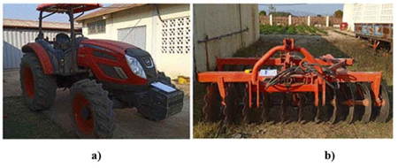 Para a avaliação dos índices tecnológicos e exploração no processo de apos aração, utilizou-se o tractor Kioti modelo PX 1002 (Figura 1a) unido a grade integral Joper modelo GM 22-24 de 920 kg. Esta de acordo ás especificações do fabricante deve ser acoplada a um tractor de 90 a 100 HP (Figura 1b).