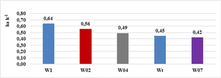 No caso da produtividade por hora de tempo limpo (W1), obteve-se um valor de 0,64 ha h-1, resultado este que esta abaixo dos valores alcançados por Abreu et al. (2021) e González et al. (2017) os quais foram de 1,28 e 1,83 ha h-1 respectivamente. Estes autores pesquisaram conjuntos agrícolas que apresentam uma largura de trabalho superior à utilizada no presente estudo. Também incidiu neste valor o subaproveitamento do tempo limpo (T1). Quer dizer, tempo de trabalho, no qual todos os órgãos de trabalho principais da máquina encontram-se sob carga. Motivado pelos diferentes tempos consumido em outras operações como regulações (T32), eliminação de falhas técnicas (T42), tempo de descanso do pessoal (T5) e o trajecto do estacionamento ao campo (T61).