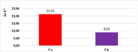 O gasto específico de combustível (Ce) e por hora de tempo de exploração (Ch), do conujuto avaliado apresentou os seguintes valores de 21,20 e 8,93 l ha-1 respectivamente (Figura 3). Estes resultados constituem uma contribução, pois permitem realizar uma planificação do gasóleo quando for preciso estabelecer previamente, um plano de trabalho racional com este conjunto, para estas condições de exploração ou similares.