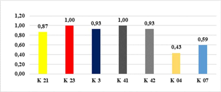 No caso do coeficiente de serviço tecnologico (K23) e o coeficiente de segurança tecnológica (K41) obteve-se um valor igual a unidade (1,00). Resultado que é considerado de favorável e que tem coincidencia com os reportados por de la Rosa et al. (2014). As causas de estes resultados são que o primeiro indicador depende do tempo principal ou limpo (T1) e do tempo de parada tecnológica (T23) o qual é igual a zero. Pois este conjunto agrícola não tem necessidade de executar paradas para o abastecimento de materias tecnológicos tais como, semientes, fertilizantes, etc. O segundo indicador depende do tempo limpo (T1) e do tempo para eliminar as falhas tecnológicas (T41) o qual é igual a zero também, devido a que durante o trabalho não executaram-se paradas por embotamento das ferramentas de trabalho da grade.