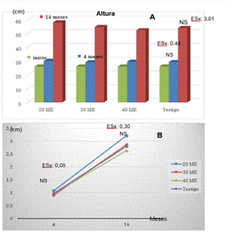 Las Figuras 1 a la 4, reflejan el comportamiento de la dinámica de crecimiento de las plántulas a partir de los indicadores evaluados. Cada figura muestra en dos gráficos (A y B), el valor absoluto alcanzado por cada variable y la magnitud del incremento mensual en los dos momentos de muestreo seleccionados para medir el desarrollo de las plántulas (4 meses y 14 meses), el periodo de 14 meses coincide con el tiempo total de duración del vivero y etapa experimental.