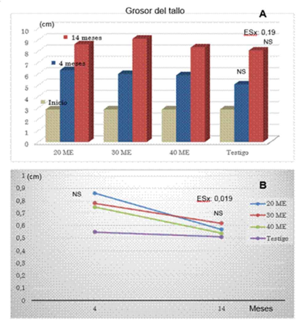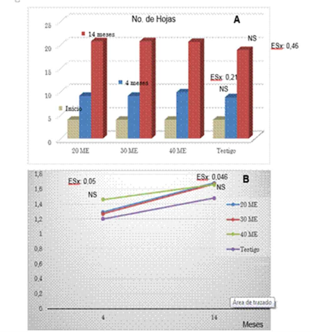 En el número de hojas los valores que se alcanzan a los 14 meses (Figura 2 A) muestran valores propicios para el desarrollo del cultivo en todos los tratamientos por igual, de acuerdo con los parámetros establecidos en el instructivo técnico Minag-Cuba (2016), donde se plantea que el número de hojas no debe ser inferior a 15.