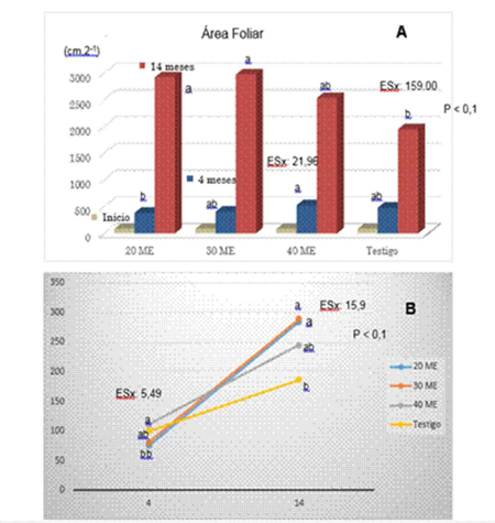 En relación al incremento mensual del área foliar (Figura 3 B) el comportamiento entre los tratamientos es muy similar al mostrado para el valor total alcanzado (Figura 3 A) en los dos momentos de muestreo. Las plántulas que recibieron las dosis de 20 y 30 L/ha-1 de ME desarrollaron mayor capacidad para producir nueva biomasa, comparadas con el tratamiento control donde no fueron tratadas con los ME.
