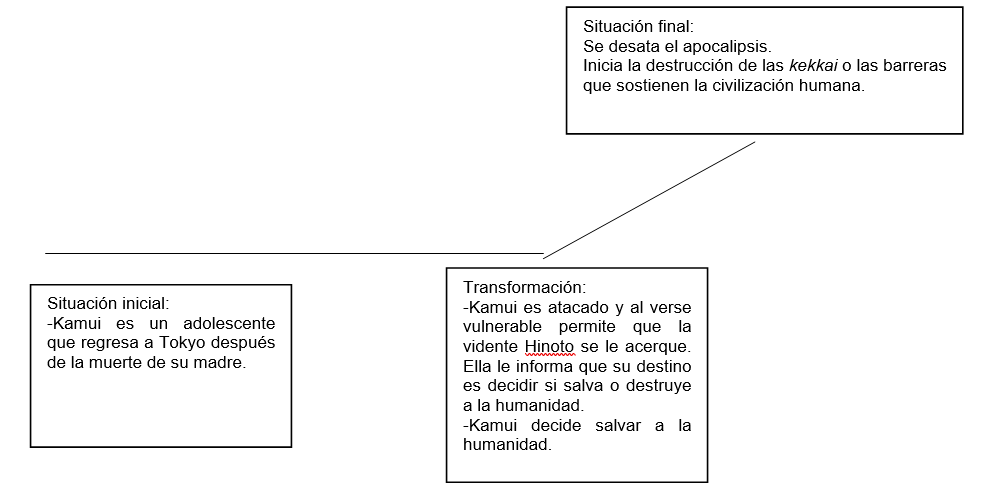 El esquema de la narración se encuentra estructurado a partir de la sintaxis de las acciones de los actantes, los cuales son todo aquello que cumple una función en el relato; pueden ser un personaje, un animal, un objeto o incluso un elemento abstracto (Balderrama, 2008). Las funciones determinan las acciones de los actantes dentro del relato y pueden dividirse en distribucionales o integradoras: las primeras a su vez se dividen en dos más: nudos y catálisis; por su parte, las integradoras se dividen a su vez en índices e informaciones (Beristáin, 1984). Por razones de espacio no nos ocuparemos de las funciones integradoras, sí mencionaremos las distribucionales con la finalidad de dejar en claro el papel que ocupan los diversos elementos religiosos, que se hallan en apariencia desarticulados en el relato de X.
