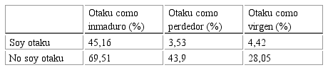 En la tabla 1 se puede observar que, si bien auto-adscriptos al término otaku como no auto-adscriptos, en menor o mayor medida catalogan a los otakus como inmaduros, en otros dos estereotipos negativos es muy fuerte la diferencia entre ambos.