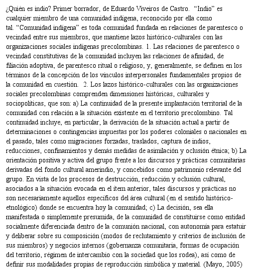 Bien, hablemos entonces de la experiencia ficcional a la cual me dediqué, al proponer una definición “jurídica” de “indio”. Tal definición, insisto, es un ejercicio escolar. No se trata de un proyecto de ley (ni siquiera), sino un intento sin pretensiones de responder a colegas que creen que la cuestión de saber quién y qué es indio puede tener una respuesta distinta a aquella que es dada prácticamente por los indios, pasados, presentes y futuros.