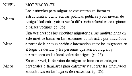 En el estudio Dinámicas migratorias en América Latina y el Caribe (ALC), y entre ALC y la Unión Europea publicado por La Organización Internacional para las Migraciones (2015) se refleja que entre los componentes macro, meso y micro que originan los flujos migratorios sobresalen los factores políticos y de extrema pobreza y desigualdad reinante en la región (Garay, Pérez, Changala, y Córdova, 2017) (Tabla 2).