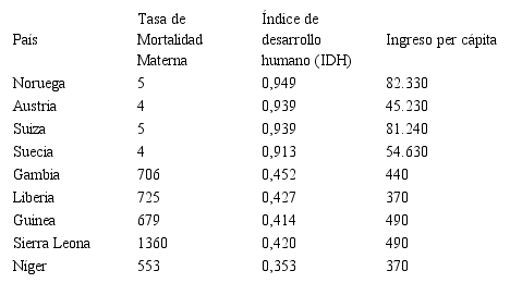 Discursos academicistas, tachonados de los tecnicismos del lenguaje de moda en el momento y que al unísono con los pobres del mundo han migrado consuetudinariamente al olvido. En consecuencia, los llamados países del sur, víctimas propicias de una globalización fallida y de experimentos disímiles de modelos económicos de prueba y error, en plena era de adelantos sin precedentes en la ciencia y en la tecnología exponen cifras vergonzosas como se observa en la tabla 3. donde países del norte como Noruega, Austria, Suiza y Suecia presentan una Tasa de mortalidad materna entre cuatro y cinco por cada 100.000 nacidos vivos; en contraste, países como Sierra Leona, Liberia y Gambia exhiben mortalidad materna de 1360 725 Y 706 respectivamente (UNFPA, 2016).