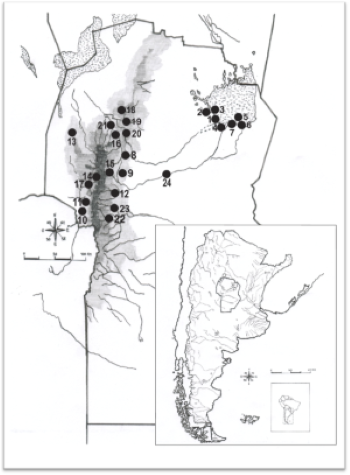 1. Sitio El Diquecito (11 individuos) 2. Sitio Estancia La Elisa (2 individuos) 3. Sitio El Mistolar 4. Sitio Laguna del Plata, 5. Sitio Isla Orihuela (2 individuos), 6. Sitio La Orihuela (2 individuos), 7. Sitio Colonia Muller, 8. Sitio Ecoterra, 9. Sitio Potrerillo de Larreta, 10. Sitio Loma Bola (3 individuos), 11. Sitio Guasmara (2 individuos), 12. Sitio Los Molinos, 13. Sitio Rosca Yasco, 14. Sitio Copina, 15. Sitio Constantinopla, 16. Sitio Ayampitin, 17. Sitio Cañada Larga, 18. Sitio Ischilin y Nunsacat, 19. Sitio El Vado, 20. Sitio La Granja, 21. Sitio San Esteban, 22. Sitio Banda Meridional del Lago, 23. Sitio Lote 5 Santa Rosa (2 individuos), 24. Sitio Rincón.