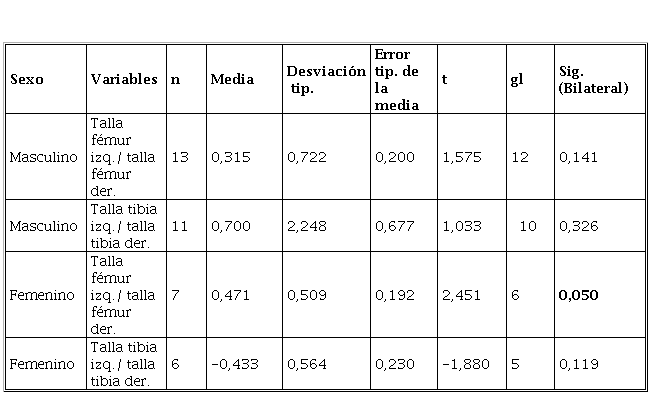 En la Tabla 2 se presentan los resultados de la comparación de las estaturas obtenidas con los elementos anatómicos de distinta lateralidad, por sexo. De las cuatro comparaciones realizadas, los resultados fueron significativos en el caso de las estaturas estimadas con fémur en individuos femeninos, por lo que solo se tuvo en cuenta el fémur derecho para las estimaciones de la talla. Cuando se encontró ausente el fémur derecho, se asignó la estimación realizada con base en la tibia.