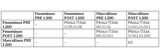 Fuente: elaboración propiaPara determinar si existió dimorfismo sexual en la muestra analizada, se aplicó la prueba de Mann- Whitney para las distintas comparaciones ya nombradas. Se encontraron diferencias significativas en y entre periodos cronológicos. En la Tabla 3 se presentan los resultados de las comparaciones realizadas con base en el sexo entre los periodos cronológicos propuestos. En el caso de los individuos masculinos previos al 1200 AP no se encontraron diferencias significativas para fémur al comparar con femeninos de ambos periodos, pero sí para la comparación con tibia. Tomando al grupo de individuos masculinos posteriores al 1200 AP se encontraron diferencias significativas para tibia en comparación con los femeninos de momentos iniciales al Holoceno tardío, pero no para fémur. En la comparación entre sexos del mismo periodo (post 1200 AP) sí se encontraron diferencias significativas tanto para fémur como para tibia.