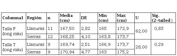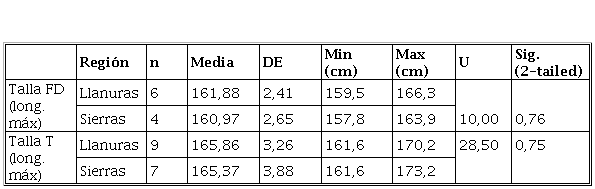 En el caso de los individuos femeninos, la media calculada para fémures derechos fue de 161,8 cm en llanuras y de 160,9 cm en sierras, tendencia similar a la observada en las estaturas calculadas con base en la tibia, donde en la región llanuras se obtuvieron las tallas más elevadas. Las diferencias no fueron estadísticamente significativas (Tabla 4).