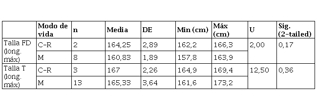 Referencias: FD (fémur derecho), T (tibia), C-R (caza y recolección), M (mixta), DE (desvío estándar), U (valor p de la prueba U de Mann-Whitney)