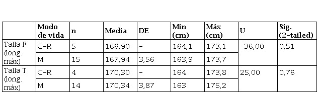 En el caso de los individuos femeninos, se observó la estatura estimada para fémur. En aquellos agrupados en un modo de vida basado en la caza y la recolección fue de 164,2 cm, mientras que la estatura promedio en individuos que habrían desarrollado estrategias mixtas seria de 160,8 cm. Un patrón similar se observó al estimar estaturas a partir de tibias, siendo más elevadas las estaturas para individuos con un modo de vida basado en la caza y la recolección. Pese a estas diferencias, las mismas no fueron estadísticamente significativas (Tabla 6). Finalmente, la estatura estimada para individuos masculinos bajo un modo de vida basado en la caza y la recolección es de 166,9 cm (fémur), mientras que para individuos que desarrollaron estrategias de subsistencia de tipo mixta es de 167,9 cm. Las estaturas estimadas a partir de la tibia fueron similares. No se encontraron diferencias significativas en el caso de las comparaciones realizadas tanto en fémur como en tibia (Tabla 7).