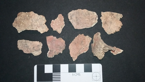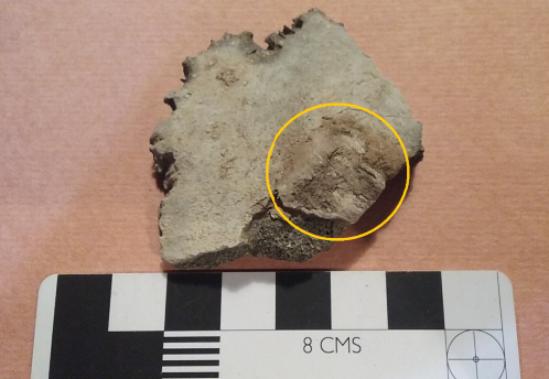 El material cultural es escaso (N: 8) y se compone principalmente de chaquiras hechas sobre valva (N: 2) y diversos artefactos líticos (N: 6) que no presentan evidencia de alteración térmica. Entre los artefactos líticos se destaca la presencia de dos puntas de proyectil de sílice y chert, una hallada inserta en la epífisis distal de húmero adulto parcialmente carbonizado y la otra ubicada entre dos vértebras lumbares adultas sin quemar. Por último, durante el trabajo de laboratorio se registró la presencia de una sustancia blanca y pastosa adherida 12 fragmentos óseos (Figura 7). El 91,6 % (N=11) de estos elementos pertenecen a individuos adultos y presentan algún estado de termoalteración, en su mayoría carbonizados (11/12=91,6 %), y solo un caso calcinado.