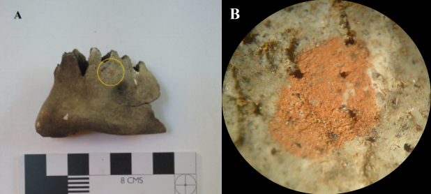 El 11,7 % (539/4578) de los restos óseos presentan marcas de ocre de distintas morfologías. De este total, el 52,7 % (284/539) presenta marcas de ocre en forma de puntos distribuidos en el hueso (puntiforme) (Figura 8A-B), mientras que en el 47,3 % (255/539) el ocre se distribuye de forma uniforme (Figura 9) sobre la superficie de los restos y con distintas extensiones.