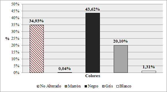 Con respecto a la coloración primaria, se observa que predominan las tonalidades negras y grisáceas, y los valores más bajos corresponden al color blanco y a la coloración marrón (Figura 4). En su mayoría fueron registrados al menos dos colores por espécimen óseo (1695/4578=37,02 %), y el 28,05 % (1284/4578) presenta un solo color. Entre los estados de termoalteración presentes, en general predomina la Carbonización Parcial (819/4578= 17,9 %) y Completa (964/4578=21,06 %) de los restos, mientras que el 25,3 % (1159/4578) presenta Calcinación Parcial, y solo el 0,8 % (37/4578) Calcinación Completa.