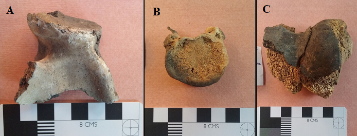 La mayoría de los huesos (1479/4578=32,3 %) presentan termoalteración total (Figura 5A), mientras que el 29,8 % (1368/4578) fue termoalterado parcialmente y solo el 2,8 % (132/4578) de los huesos presenta una alteración mínima de su superficie (Figura 5B). La combustión afectó principalmente a los tejidos cortical y trabecular de forma simultánea (2903/4578=63,4 %), y un escaso número (76/4578= 1,6 %) presenta termoalteración solo del tejido cortical (Figura 5C). A su vez, se observa que de los restos óseos que conservan las regiones articulares (2397/4578=52,4 %), el 70,8 % (1699/4578) presentan evidencias de termoalteración.