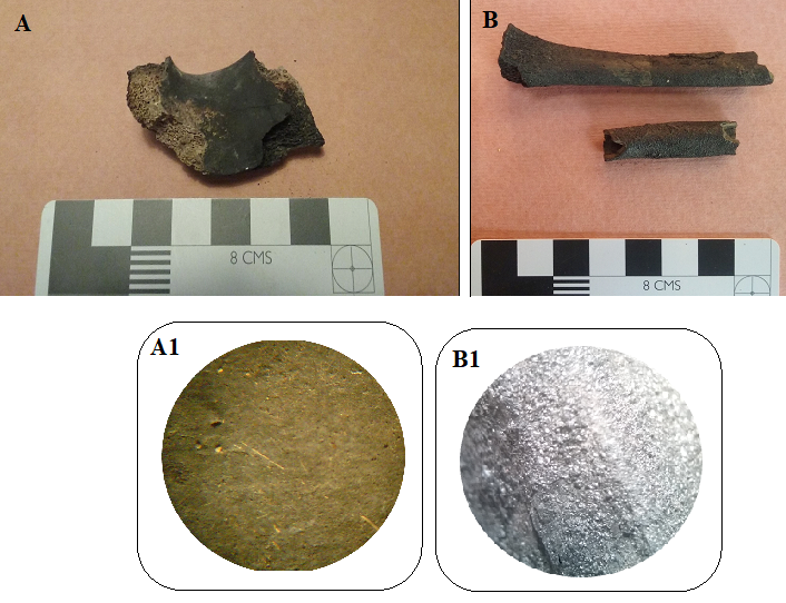 Con respecto a las texturas primarias registradas en la superficie cortical de cada hueso y los estados de termoalteración asociados, se observa un predominio general de texturas lisas (1072/4578=23,4 %), principalmente en restos óseos Parcial y Completamente Calcinados (Figura 6A-A1). El 16,6 % (762/4578) de los huesos registran una apariencia granular y opaca asociada a huesos Parcial y Completamente Carbonizados. La textura vidriosa-granular (Figura 6B-B1) se registra en el 14,9 % (683/4578) de los casos, especialmente en huesos Parcialmente Calcinados y, en menor cantidad, en Parcialmente Carbonizados. Además, se determinó que el 6,3 % (288/4578) de la muestra presenta una textura áspera, principalmente en huesos Parcialmente Carbonizados y en menor medida en aquellos Completamente Calcinados. Las superficies de tipo Chalky (86/4578=1,87 %), suaves (62/4578=1,35 %) y polvorientas (5/4578=0,10 %) se presentan en bajas cantidades asociadas a huesos Parcial y Completamente Calcinados. Finalmente, se registró un agrietamiento pronunciado de la superficie cortical en el 0,46 % (21/4578) de los huesos quemados, particularmente en aquellos Total o Parcialmente Carbonizados.