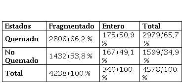 De los 4.578 especímenes óseos, el 65,07 % (N: 2979) presenta evidencia de termoalteración. Estas evidencias de combustión se presentan principalmente en huesos fragmentados, mientras que los restos óseos enteros se presentan en bajas proporciones y al menos la mitad de ellos se encuentran quemados (Tabla 1).