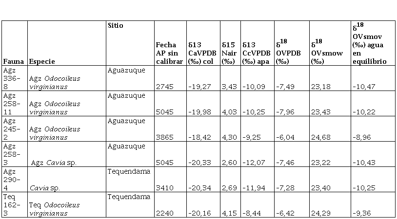 A partir de los resultados obtenidos, se puede observar que en Aguazuque y Tequendama los valores de δ13C son bajos, es decir, los recursos C3 son tanto animales como vegetales. Prevaleció un consumo de recursos vegetales C3 y animales, que, a su vez, consumieron pasturas bajo ese patrón fotosintético. En los valores de δ15N se observa una dispersión amplia. Aunque los valores de proteína son bajos, se puede sugerir quizá un consumo asociado a proteína terrestre y vegetal (Triana, 2019).