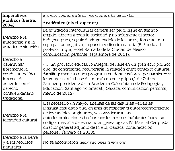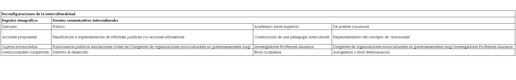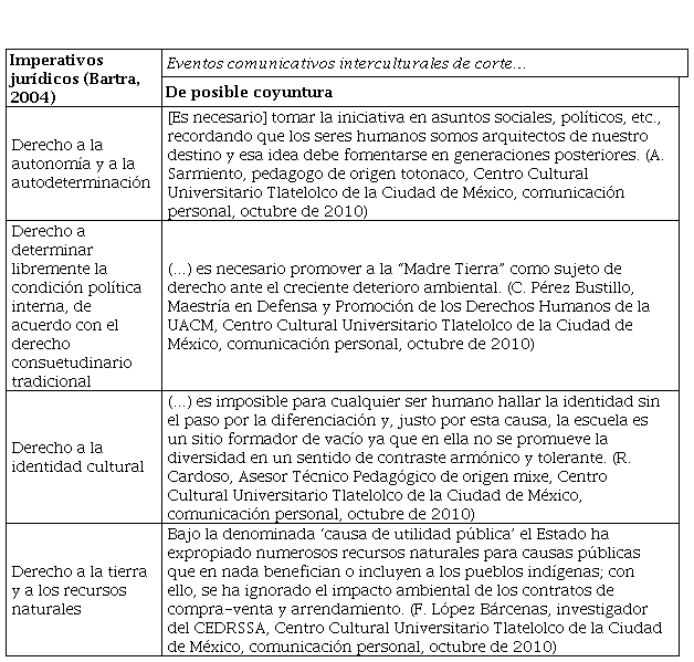 Por otro lado, los eventos interculturales de posible coyuntura toman una postura menos flexible y más bien apelativa, pues se trata de formatos discursivos que representan a los grupos minorizados históricamente y, por tanto, ávidos de reconocimiento. Empero, existe un rasgo paradójico en ello que reside en la conformación de estos encuentros, pues también aquí están presentes los dirigentes de organizaciones socioculturales no gubernamentales, investigadores y profesores que se plantean como tarea primordial colocar el concepto de ‘autonomía’ como categoría jurídica funcional. Por lo tanto, la intencionalidad de estos eventos tiende, de principio a fin, hacia la propuesta de gobiernos autogestivos y a la libre determinación de sus grupos culturales.