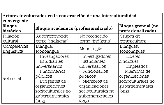 Las redes de organización y ejecución de los foros para discutir la agenda política y cultural del país parten de una iniciativa académica en la mayor parte de los casos, pues la petición de espacios no es un asunto sencillo de salvar cuando la convocatoria es amplia y se pretende diversa. Por ello, se ha dividido en dos grandes sectores la naturaleza de sus participantes, a saber: profesionalizado y no profesionalizado. La razón estriba en la combinación de factores que llevan a los sujetos interculturales a identificarse con uno u otro gremio; es decir, resulta más viable hablar de un sujeto bilingüe no profesionalizado que de un empleado que no se reconoce como indígena, pero que emprende un activismo político de contracultura. El asunto, en ambos casos, es que ese actor es relevante por el bloque histórico al que pertenece, entendido como una relación de representación en donde “se produce el intercambio de elementos individuales entre gobernantes y gobernados, entre dirigentes y dirigidos [y entonces] se realiza la vida de conjunto, la única que es fuerza social” (Portantiero, 1981: 122). También, la filiación lingüística y cultural es importante en cuanto se le dota de identidad a dicho actor, pues la lealtad le llevará a fungir en uno u otro papel dentro de la escena social y política de su entorno. Así, el reconocimiento y adscripción a un grupo diferenciado de la hegemonía cultural brinda la oportunidad de establecer grupos más cohesionados por los significados que comparten a nivel simbólico y vivencial.