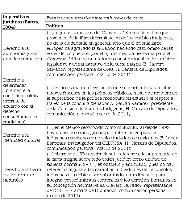 Las declaraciones temáticas plantean que la armazón jurídica con la que México cuenta no cumple con los estándares del derecho internacional, una línea discontinua entre gobierno y ciudadanía que tiene su origen en los planteamientos hechos desde su carta magna. Así, se asoma de forma constante la propuesta, todavía incipiente, de modificar las leyes para dar reconocimiento a la multiculturalidad de facto, negada sistemática e históricamente en las instituciones del país. Este discurso, emitido por funcionarios públicos desde la vía protocolaria, no constituye todavía un discurso de posible coyuntura ya que, entre otros factores, el enunciador es el administrador y ejecutor de la normatividad vigente.