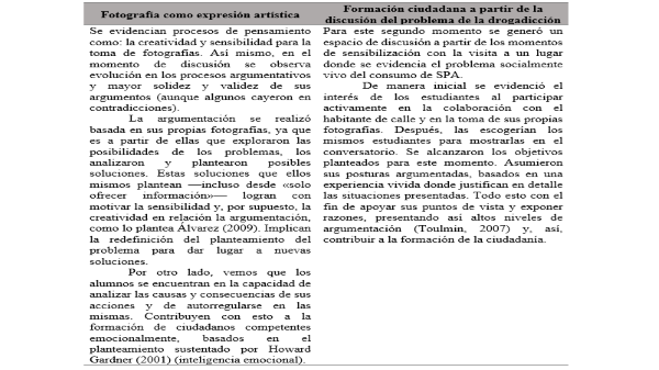 En los talleres se manifestaron gran cantidad de sensaciones y emociones que los estudiantes experimentaron en distintos momentos vividos en las tomas fotográficas. Así, este fue un espacio para desnudarse frente a la impotencia que muchos de ellos manifestaron sentir por no tener el poder para acabar con este mal que aqueja a su comunidad. Los diálogos grabados al respecto dan cuenta de sus emociones al capturar parte de la realidad social. En esta fase, el hecho de que en su discurso se escucharan términos usados indebidamente como “locos” llevó a continuar orientaciones conceptuales, así como a abordar el problema a través de charlas y conversatorios con expertos y con personas (amigos, conocidos y familiares) que quisieron contar sus experiencias personales. En la tabla 1 se presenta el análisis de resultados realizado para este momento.