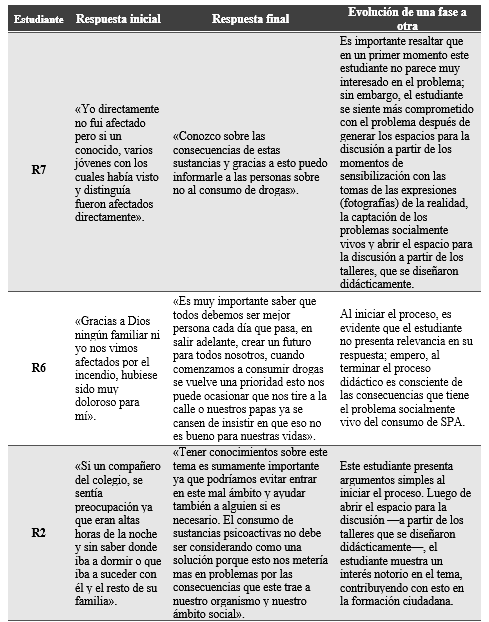 Teniendo en cuenta lo expuesto, se puede observar cómo los estudiantes citados en la figura 8 fueron mejorando sus ideas y expresiones conceptuales acerca del problema socialmente vivo de la drogadicción o consumo de sustancias psicoactivas. El conflicto fue vivenciado por los alumnos gracias a la fotografía, al tiempo que aprendieron sobre sus consecuencias mediante el apoyo de la fundación Todo por amor a Dios. Esto les permitió dar unas respuestas más sólidas y estructuradas acerca de las situaciones problema que se les presentaron, lo que a su vez evidenció que este proceso de argumentativo —acompañado de escenarios creados por ellos gracias a sus propias fotografías— movilizó los elementos necesarios que promueven en el joven el desarrollo de un pensamiento más reflexivo frente al problema socialmente vivo y la expresión de este.