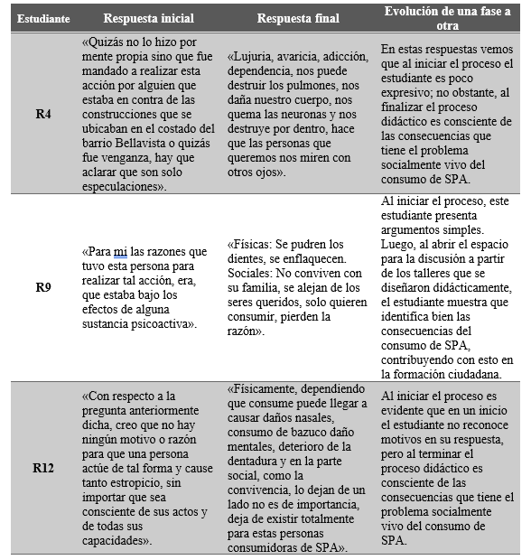 En esta fase se pudo evidenciar, además, que los estudiantes brindaban solo respuestas afirmativas o negativas, sin ninguna clase de argumentación, a pesar de haberles solicitado que brindaran las razones que tenían para optar por una posición u otra. Algunos otros alcanzaron respuestas con argumentos cortos en los que presentaban la drogadicción como un problema que les compete socialmente y que relacionan con su entorno, iniciándose en una reflexión crítico-social sobre el consumo de sustancias psicoactivas. No obstante, en esta primera fase los alumnos de estos casos no lograban reconocerse como parte del problema; por sus expresiones, era como si fueran ajenos a la problemática social.