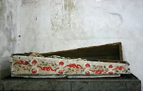 En mayo de 1982, durante el proyecto de consolidación y remodelación de la iglesia de San Juan Bautista con la intención de recuperar las estructuras originales del piso, los trabajadores encontraron tres entierros momificados bajo el subsuelo del inmueble, con sus respectivos ataúdes de madera policromada y en perfecto estado de conservación. Uno de ellos estaba localizado en la parte izquierda de la puerta principal (entierro 1), y los otros dos, en el centro de la nave (entierros 4 y 10). Se trata de tres individuos infantiles (figura 7).