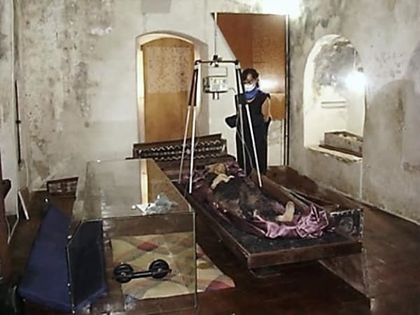 En la figura 8 se puede apreciar la distribución de los entierros en el presbiterio, la superposición de algunos entierros de niveles superiores con el anterior, y la forma y variedad de estilos de ataúd: con tapa plana y de forma piramidal. En las figuras 9, 10 y 11 se observan algunas de las momias evaluadas para este estudio.