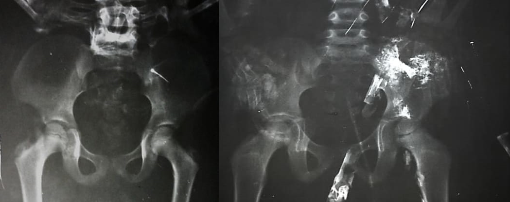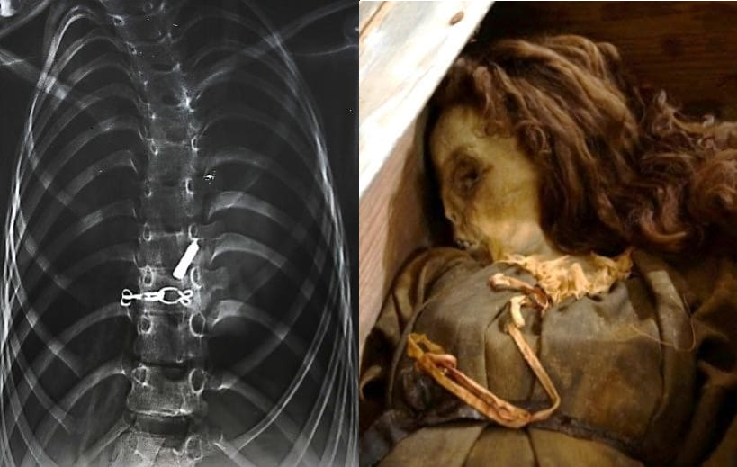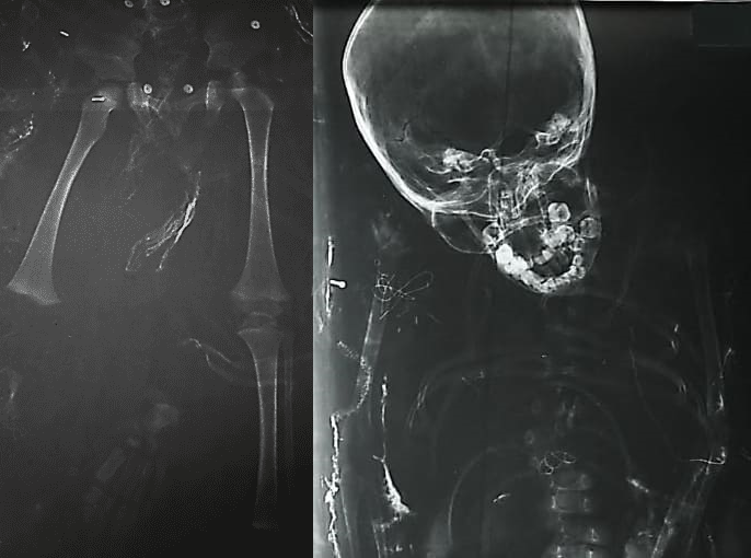 Izquierda: momia infantil 8. Se aprecia ausencia de tibia y peroné derechos, así como pie izquierdo fuera de lugar. Derecha: momia infantil 7. Se aprecia vértebra cervical en cráneo y caja torácica desarticulada.