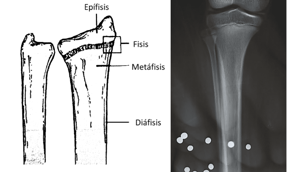 La fisis es el principal centro para el crecimiento longitudinal y la expansión circunferencial de los huesos largos, incluidas las falanges. Está formada de cartílago, que madura con rapidez en los huesos de las extremidades, se colapsa continuamente y es reemplazado por hueso durante el crecimiento. Así pues, es visible antes de alcanzar el tamaño adulto, y posteriormente es reabsorbida y reemplazada por un hueso que une la epífisis de manera permanente con la metáfisis (Terry-Canale, 2000) (figura 21).