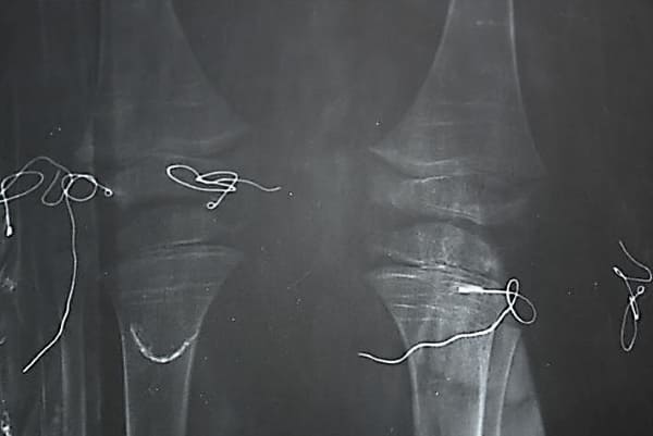 Izquierda: diagrama tomado de Terry-Canale (2000, p. 18). Derecha: articulación de rodilla izquierda de la momia 6