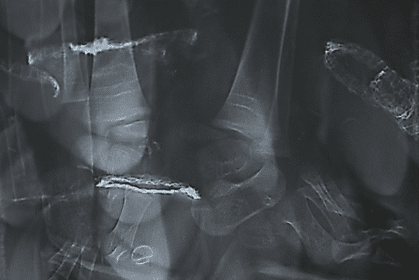 La osteoartritis es visible en algunas articulaciones de la momia 9, con afectación ligera de la columna vertebral. También se ven comprometidos la articulación sacroilíaca, el acetábulo femoral, la rodilla y el tobillo (figuras 29 y 30). Cabe anotar que en los demás segmentos óseos no es posible evaluar la presencia de estas lesiones por la superposición de imágenes o porque no se radiografiaron todos los segmentos anatómicos de la momia.
