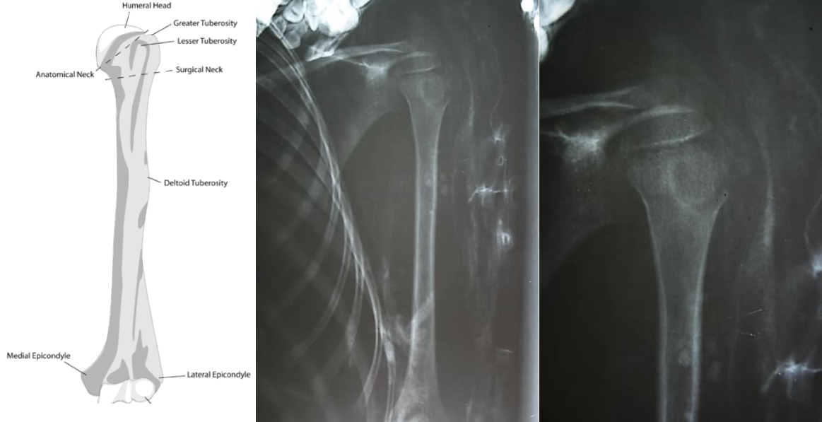 A través de la radiografía anteroposterior de extremidades superiores, se pudo identificar un traumatismo o fractura subcapital (que afecta a cualquier zona proximal del húmero) en el extremo superior del húmero izquierdo. Específicamente, se trata de una fractura en el área del troquíter (tuberosidad de la cabeza humeral que da inserción al músculo supraespinoso), con desplazamiento bajo el acromion.