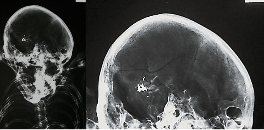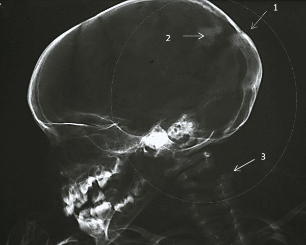 En la figura 26 se observa el traumatismo en vértice de la sutura lamboidea, con pérdida de la continuidad de cortical (1), así como una imagen bilobulada de bordes irregulares como consecuencia del impacto (2). A raíz del traumatismo, se ocasionó alargamiento del espacio intervertebral entre C2 y C3 con 10° de angulación (3), que probablemente pudo provocar daño medular.