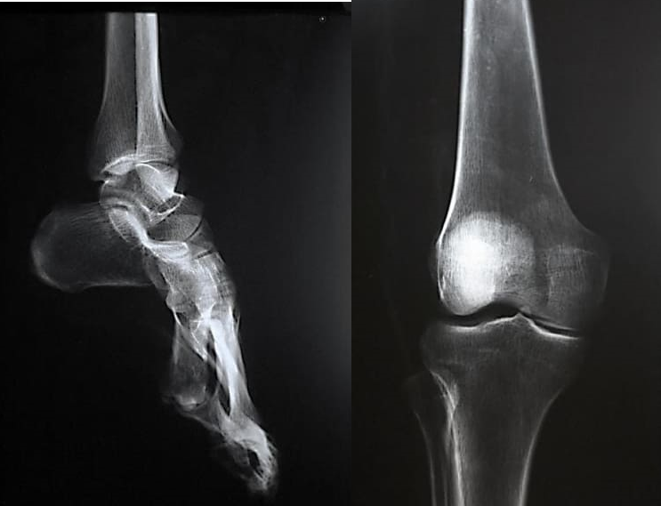 Izquierda: artrosis de rodilla izquierda o gonartrosis; se aprecia afectación del compartimento femorotibial interno, con disminución del espacio intertibial. Derecha: disminución del espacio articular en tobillo derecho