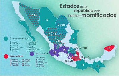 En lo que respecta a México, se han descubierto restos momificados o parcialmente momificados, tanto de humanos como de animales, en varios estados de la república mexicana (figura 3). Hasta el momento se puede decir que son producto de un proceso natural de desecación provocado por diversos factores que interactúan entre sí: temperatura, humedad, clima o composición del suelo donde los cuerpos fueron depositados, además del tipo de ajuar funerario y del mausoleo. Todos ellos suspenden la descomposición del cadáver durante un periodo prolongado hasta su descubrimiento, aunque luego, al despojar a este de su depósito de origen, se renueva el proceso natural de descomposición.