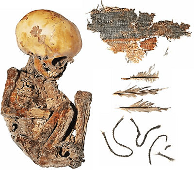 Pepita, la momia de la Sierra Gorda de Querétaro, de hace 2 300 años de antigüedad, antes del presente. Se aprecian restos de textil, plumas de ave y trenzas de cabello humano