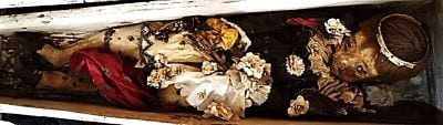 Se aprecia tipo de vestimenta, posición del cuerpo y decoración del ataúd