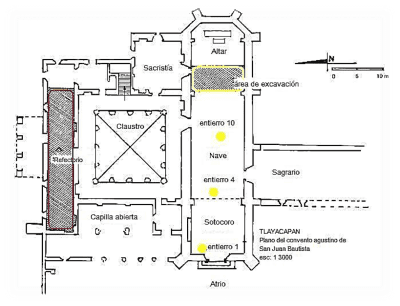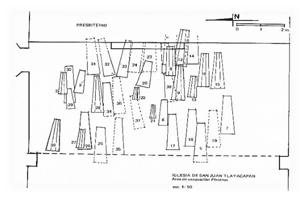 (Oliveros, 1990).El área de excavación se limitó al presbiterio, una superficie de 5,50 m por 14 m de ancho de la nave en donde se recuperaron 10 cráneos y varios huesos largos (falanges y clavículas), fragmentos de ataúd, entre otros elementos, además de los entierros antes señalados. Estos hallazgos indican la reutilización del espacio para sepultar entierros por un largo periodo.