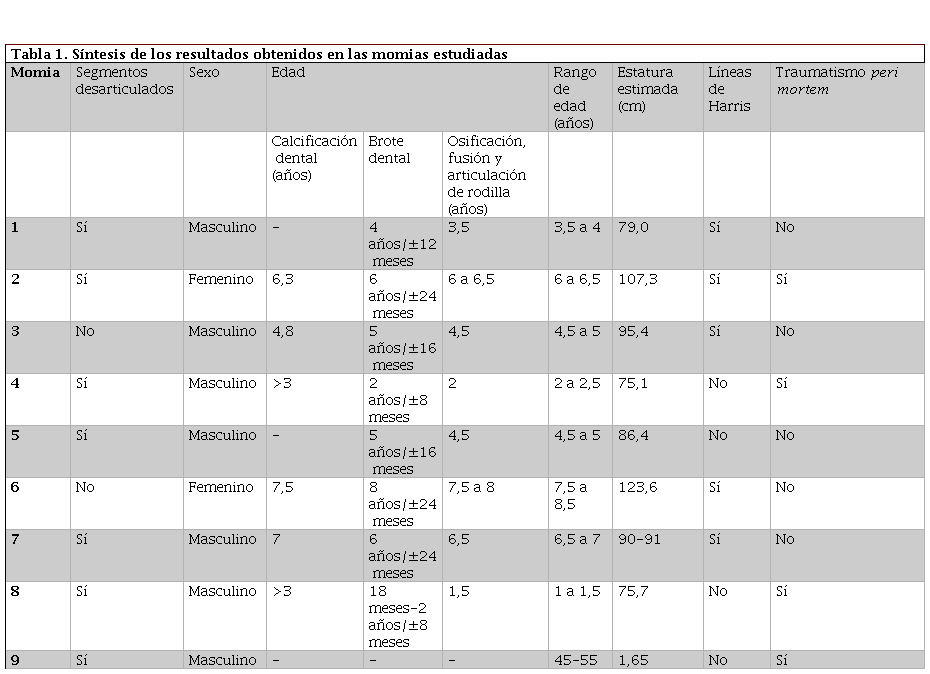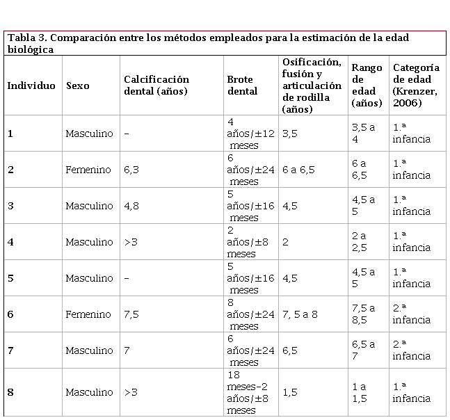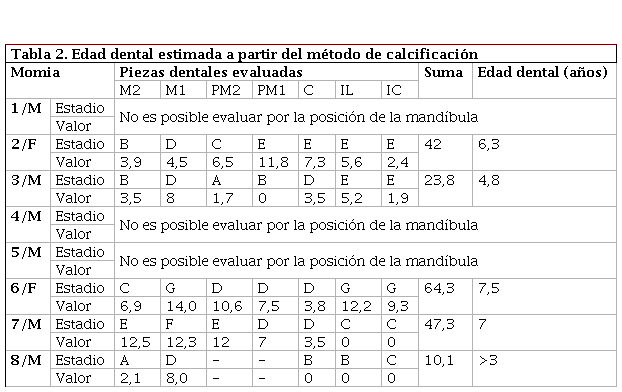 En la tabla 3 se presenta la edad estimada en las momias a partir de la calcificación de los dientes, el brote dental, la aparición de centros de osificación y fusión, así como el grado de madurez en rodilla. En cuanto a la calcificación dental, no fue posible evaluarla en los ocho individuos debido a que la posición del rostro imposibilitó la visión de todas las piezas dentales para su valoración.