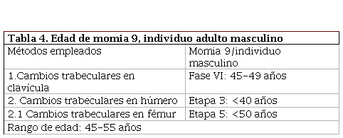 En la tabla 4 se aprecia el rango de edad que se llegó a estimar para la momia 9 a partir de los cambios trabeculares de clavícula, húmero y fémur (figura 20).