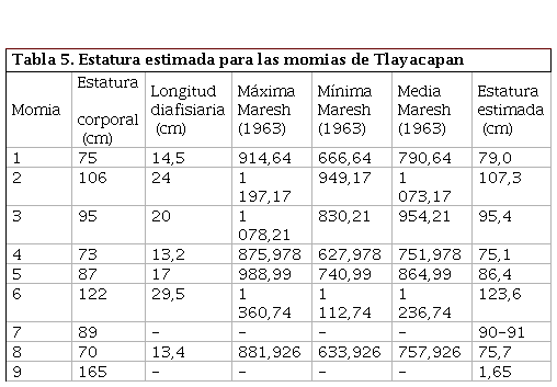 De acuerdo a estos datos, algunas de las momias de Tlayacapan presentan un retardo en el crecimiento (momias 1, 4, 5 y 7), con edades a la muerte de 2 a 6,5 años y con –2 desviaciones estándar o más respecto al grupo de referencia. Las momias que se considera no fueron afectadas en su crecimiento son las 2, 6 y 8.