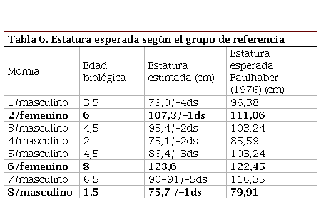 Además de conocer la talla alcanzada hasta el momento de la muerte, también es importante el estatus de crecimiento, toda vez que proporciona información sobre las condiciones de vida que experimentaron los individuos. Para conocer dicho parámetro, se tomaron como referencia los datos del estudio longitudinal de crecimiento realizado por Faulhaber-Kamman (1976) en una muestra de niños mestizos con mayor componente blanco de la Ciudad de México, correspondientes a la clase media de la sociedad, y se eligieron los valores de media por grupo de edad y la desviación estándar de estatura para cada edad según el sexo. La edad que se empleó para seleccionar la referencia es tanto la dental como la esquelética, y se considera que existió un retardo en el crecimiento de los individuos del presente estudio cuando la estatura de las momias se ubica dos desviaciones estándar por debajo de lo esperado para la edad y el sexo en el grupo de referencia (tabla 6).