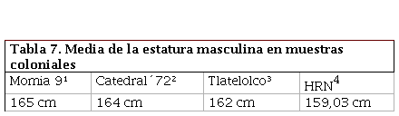 En el caso del individuo adulto (momia 9), la estatura se obtuvo por la medición de la longitud total del cuerpo (165 cm) y se comparó con la media de la estatura reportada en otros estudios realizados en muestras coloniales, como se presenta en la tabla 7.