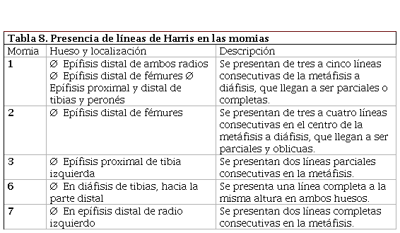 De las nueve momias que se presentan en este estudio, en cinco de ellas es posible apreciar líneas de Harris en los huesos largos. La frecuencia de líneas no es tan alta y sobre todo se presentan en tibia, seguidas del fémur, el radio y el peroné. El individuo que cuenta con mayor número de líneas es la momia 1 (figuras 22 y 23). Se describe cada caso en la tabla 8.